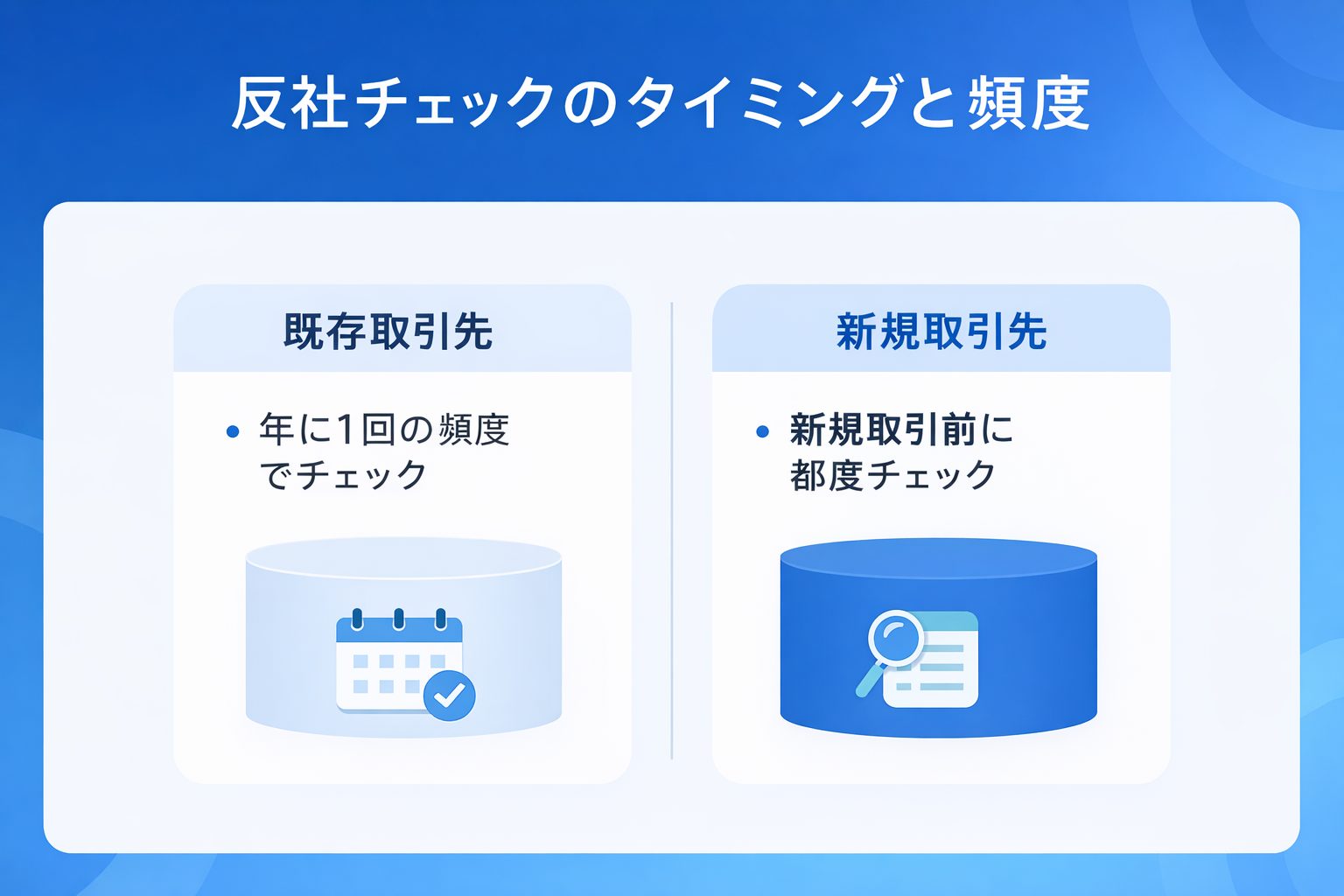 反社会的勢力は関係性を隠して近づくため、取引の継続段階や役員変更時など、リスクが高まるタイミングで再確認することで、実効性のある対策につながります。