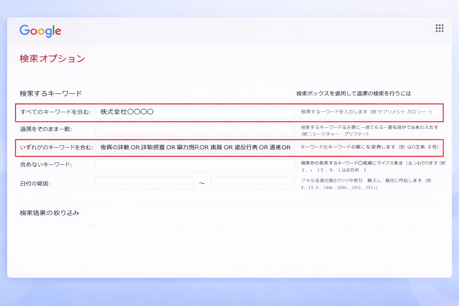 上記の画面で「すべてのキーワードを含む」に対象会社名や個人名を入力し、「いずれかのキーワードを含む」にネガティブキーワードの間にORをいれて入力します。